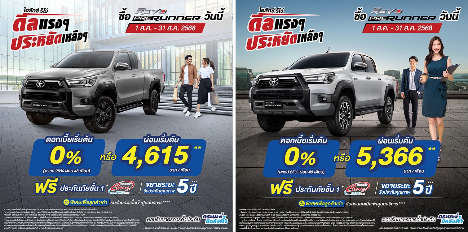 ซื้อไฮลักซ์ รีโว่ รุ่นสมาร์ท แค็บ พรีรันเนอร์ ตั้งแต่วันที่ 1 สิงหาคม 2568 - 31 สิงหาคม 2568